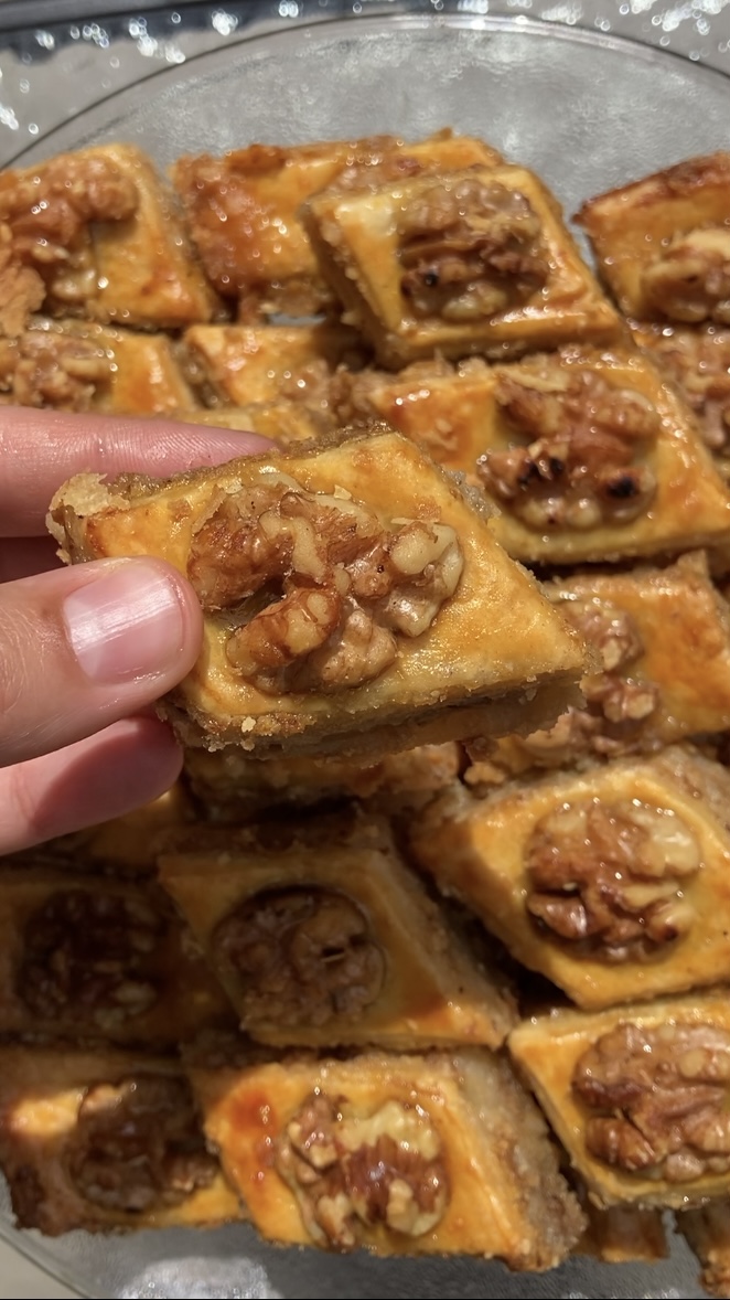 - Cut 4 vertical lines through the baklava, then cut diagonally to create diamond shapes. Brush the top of the dough with the remaining egg yolk. Gently press a walnut half into each diamond.
