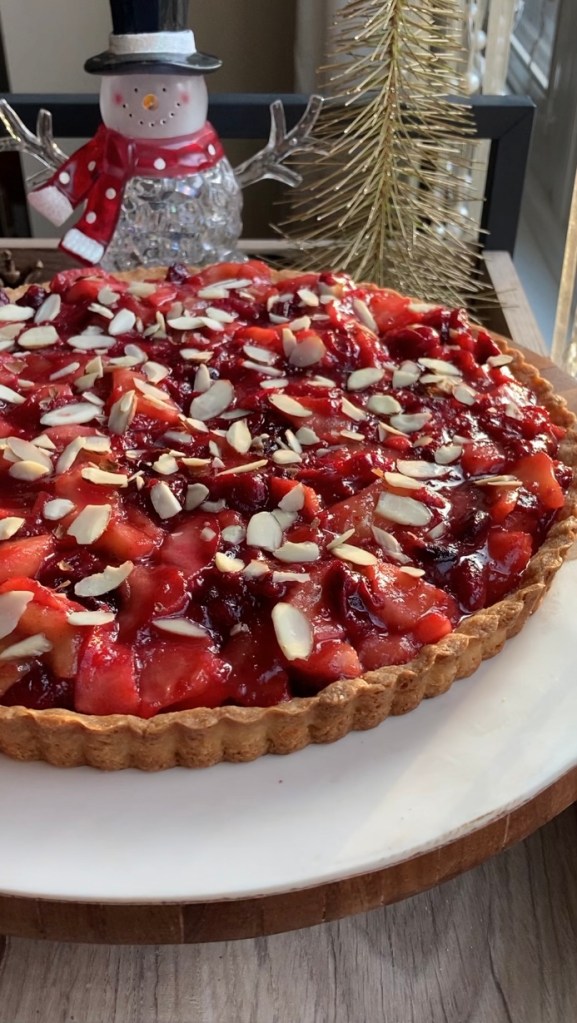 The first time I had this tart was at a local bakery near my college; I tried it and became instantly obsessed. Unfortunately, it was a seasonal item for the fall and I was graduating soon, so I couldn’t keep going back to buy it. I’ve made it my mission to recreate this amazing tart, and I think I’ve finally done it. It’s got a buttery crust, fruity but not too sweet filling, and has just a hint of almond that balances the flavors so well. And look how festive it looks!
