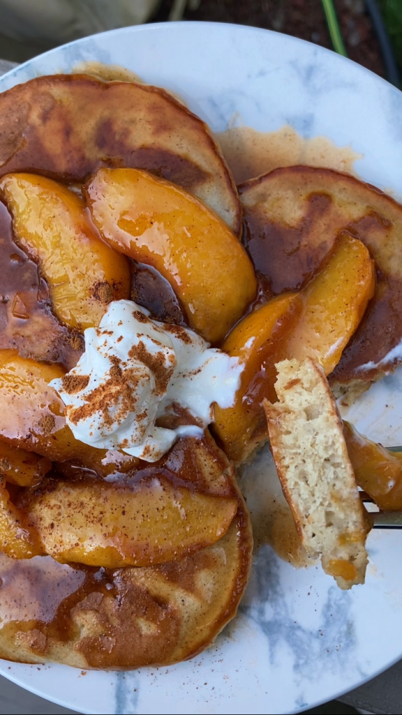 These pancakes are easy, fluffy, and a great way to use up those overripe bananas you have sitting on the kitchen counter. The real star of the show though is that peach caramel sauce. It’s made with butter, brown sugar, maple syrup, and cinnamon that perfectly complements the fresh peaches. Let’s just take a moment for that texture shot.
