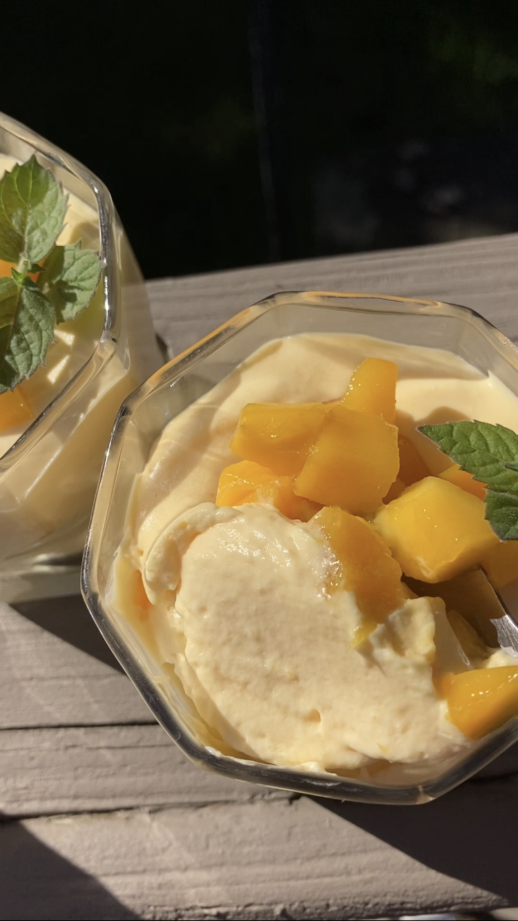 - Distribute the mousse into glasses and top with the reserved diced mango and a sprig of mint. Refrigerate uncovered for at least 4 hours before enjoying.