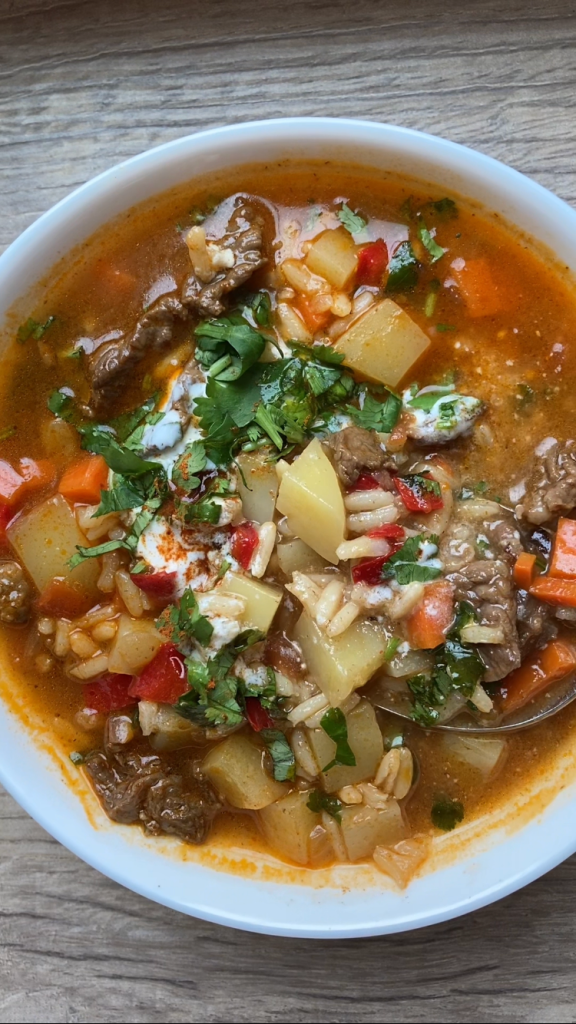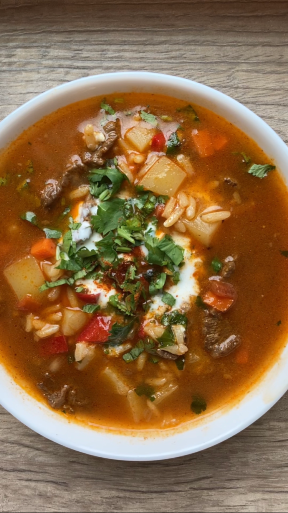 Mastava is another favorite Uzbek soup of mine made from rice, beef, and tons of vegetables like carrots, tomatoes, and red bell peppers. It’s warm, comforting, and very easy to make. We like to serve it with plain kefir and lots of herbs, but if you don’t have kefir, sour cream or plain greek yogurt would work just as well.