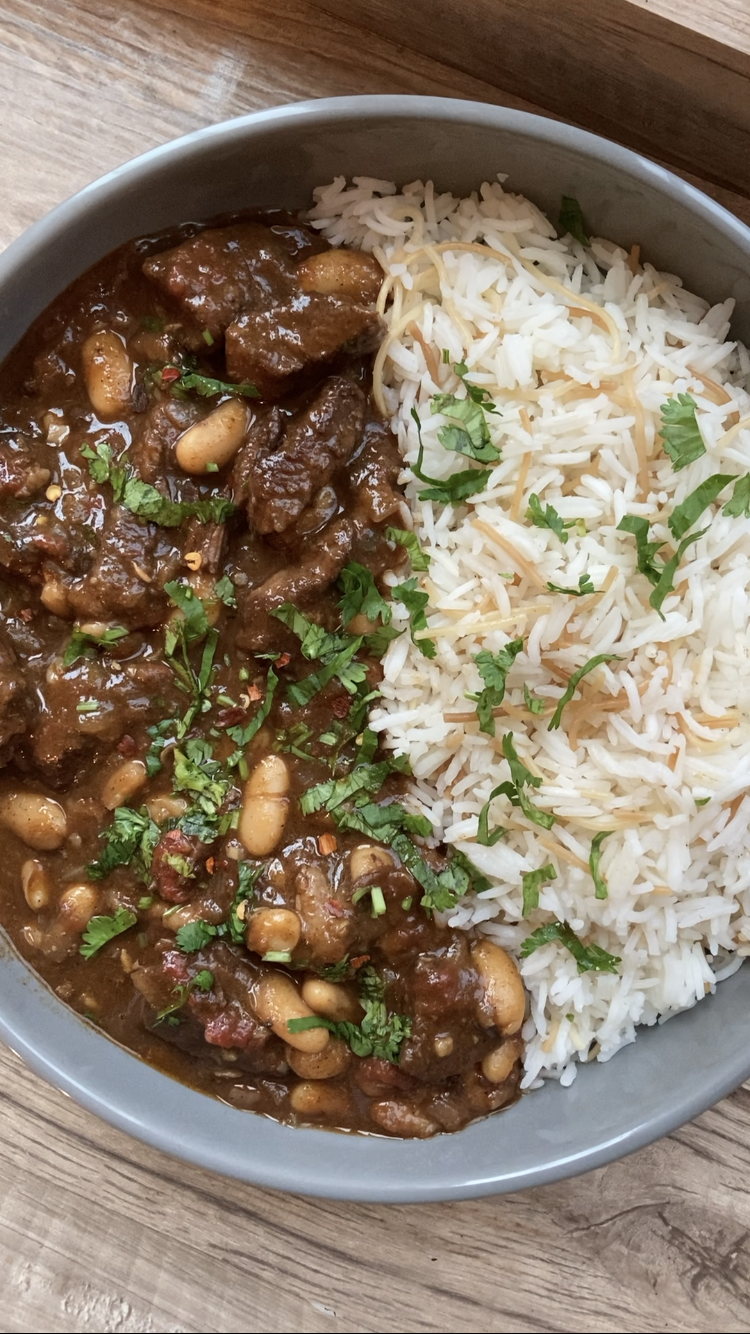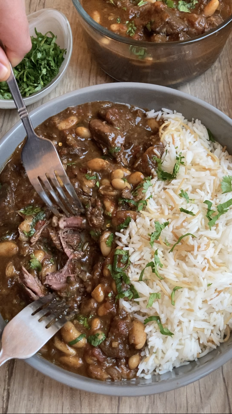 This meat and bean stew in a rich tomato sauce is popular across the Middle East and is the perfect cozy meal. I prefer using beef, but you can also make this with lamb. It’s made with very simple ingredients, warm spices, and is slow cooked so the meat becomes fall-apart tender just like this: