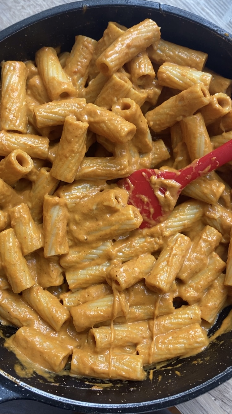- Add in the cooked pasta and mix well, adding more pasta water if needed.